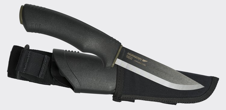 The carbon steel blade has a black DLC coating that protects it from rust and also prevents reflections from the blade. Keep in mind that carbon steel requires maintenance, so make it a habit to wipe the knife and oil it after usage. The spine has been ground so that you can use the knife together with a fire starter – so your critical fire is never far away. The knife sheath has a belt loop and clip of course keeping your knife always close at hand. The knife sheath has a MOLLE compatible cover made of strong nylon giving you a range of different mounting alternatives. FEATURES: -Blade length: 109 mm -Total knife length: 232 mm -Blade thickness: 3,2 mm -Blade hardness: 58 - 60 HRC -MOLLE/PALS compatible Knife blade of high carbon steel can be hardened to HRC 59-60 giving best possible sharpness to lowest price. Knives made from above mentioned steel grades will after some use achieve a dullish grey finish. However, this will not negatively affect the quality of the blade. On the contrary it will somewhat improve the resistance to corrosion. In order to prevent rust, make sure you put the knife away clean and dry. To best corrosive resistance apply a thin coat of oil on the blade as soon, as possible.