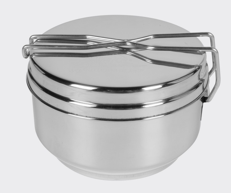 Three-pieces mess tin which consists of: 1 liter (15 cm in diameter ) and 0.7 liters (13 cm in diameter ) and cover with a diameter of 15 centimeters, which can be easily used as a frying pan. Made of electropolished stainless steel, of a gauge allowing cooking directly on the fire, without risk of burning the vessels. FEATURES: -Capacity: -Large tin: 1 liter; 15 cm in diameter -Small tin: 0,7 liters, 13 cm in diameter -Cover: 15,5 cm in diameter